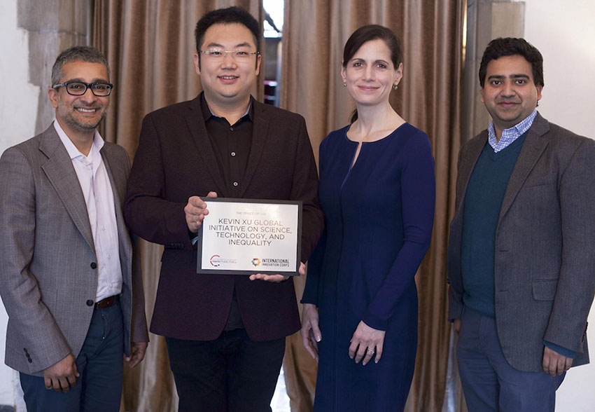 左起 Abhilash Mishra博士、Kevin Xu、哈里斯公共政策学院院长Katherine Baicker教授、芝加哥法学教授Anup Malani。