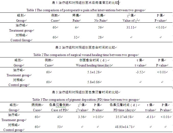¡¾Abstract¡¿Objective  To observe the therapeutic effect of MEBO Wound Ointment £¨MEBO£©in the treatment of surgical sites after spot area laser therapy. Method The 120 patients after spot area laser therapy were randomly and evenly divided into treatment group and control group. In treatment group, MEBO Wound Ointment was administered after surgery for 4-6 times a day, keeping the surgical sites moist until wound healing; In control group, the surgical sites were applied with erythromycin ointment for 4-6 times a day until healing. And then, the indicators of therapeutic effects, such as the postoperative pain relief, wound healing days, pigment deposition and fading were observed in two groups. Results Compared to control group, the postoperative pain relief and wound healing days in treatment group had significant differences(P£¼0.01); pigment deposition in two groups showed no statistical difference, but the fading time of pigment in treatment group was significantly shorter than that in control group (P£¼0.01). Conclusion MEBO Wound Ointment in the treatment of surgical wounds after spot area laser therapy is effective on rapid relief of pain, shortening healing time and promoting pigment fading, thus is an ideal therapeutic approach in the treatment of surgical wounds after laser therapy.