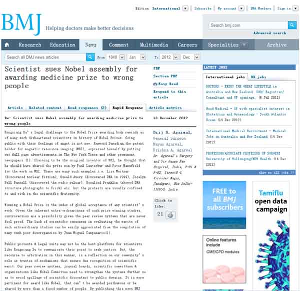 ¹ØÓÚÏñÐìÈÙÏéÕâÑùµÄ¿ÆÑ§¼ÒÀ´Ëµ£¬¹«ÖÚ¿¹æÅºÍÖ´·¨ËßËÏ¿ÉÄܲ»ÊǽÒÏþ¿´·¨¡¢×·ÇóÕýÒåµÄ×îºÃƽ̨¡£¿ÉÊÇ£¬ÕâÖÖÇóÖúÓÚÖ´·¨ÖٲõÄÊÖ¶ÎÈ´·´Ó¦ÁËÎÒÃÇ×÷ΪÄÇЩȷ±£¿ÆÑ§³É¼¨»ñµÃÓ¦ÓÐÈϿɵĸ÷»ú¹¹µÄίÍз½ÔÚʩչ×÷ÓÃʱÊÇ´æÓÐÎÊÌâµÄ¡£ÎÒÃǵÄÙÉÐÐÉó²éϵͳ¡¢ÔÓÖ¾¶­Ê»ᡢ¿ÆÑ§Î¯Ô±»áÒÔ¼°Ïñŵ±´¶ûίԱ»áÕâÑùµÄ×éÖ¯¶¼ÐèÒª½øÒ»²½ÔöÇ¿ÌåÖÆÒÔ×èÖ¹¿ÆÑ§ÁìÓòÄڵķ×ÕùÁ÷Òçµ½Éç»á¹«¹²ÁìÓò£»ÌØÊâÊǶÔŵ±´¶û½±ÕâÑùµÄ½±Ïî¶øÑÔ£¬ÕâÑùµÄ½±Ïî²»¿ÉÊÚÓè¸øÒÑÈ¥ÊÀµÄÈË¡¢Ò²²»¿É±»Áè¼ÝÒ»¶¨ÃüÄ¿µÄÈËËù¹²Ïí¡£Ó¢¹úҽѧÔÓÖ¾£¨BMJ£©ÄÜÐû²¼ÕâÒ»ËßËÏÐÂΞÍÒÑȻ˵Ã÷¿ÆÑ§ÔÓÖ¾Ò²Ó¦ÍÆÐÐÆð¡°¿´ÃÅÈË¡±µÄÖ°Ôð¶ø²»µ«ÊǼ縺¡°À²À²¶Ó³¤¡±µÄÔðÈΡ£