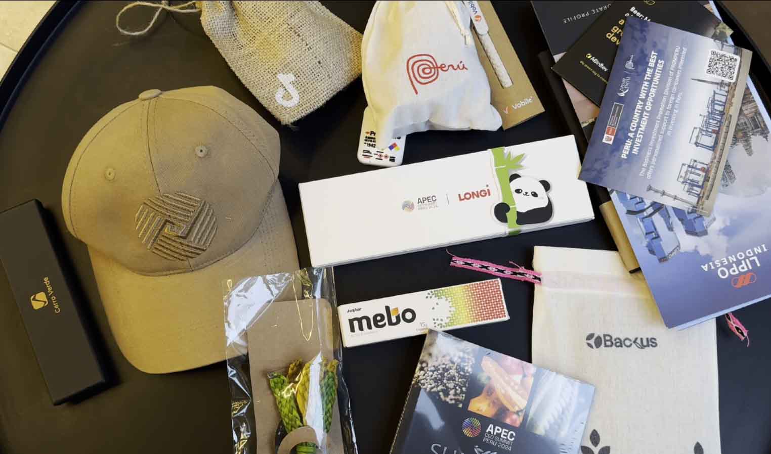 翻开礼物袋,内里包括一款带有APEC CEO峰会标记的棒球帽、一个细腻的皮质护照夹;生长在利马周边山丘上濒临灭绝的植物“紫条六出花”胸针;而秘鲁的国宝级动物小羊驼也被巧妙地设计成了钥匙链;尚有一款由百分百羊驼毛制成的秘鲁工艺品更是展现了外地人民的精湛武艺和奇异审美;为了让与会代表更好地相识秘鲁风土人情,礼物袋中还特殊配备了外地美食小册子等;值得一提的是,象征友谊的熊猫徽章也成为了礼物袋中的一份子,寓意着APEC成员国之间的友好关系和细密相助 。