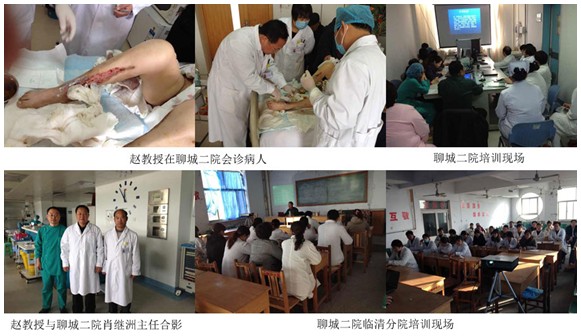 北京烧伤创疡研究所赵瑞庆教授应山东聊城人民医院、聊城第二人民医院的约请 ,于2012年11月11日-14日划分在聊城地区两所三级医院烧伤整形科举行了两期再生回复手艺的培训 ,着重解说了创面修复历程中再生回复手艺的焦点点 ,即网中网抗熏染理论、三隔离机理 ,详细讲述了创面液化物扫除体外无生命活力组织机理的历程。培训竣事后 ,赵教授还会诊了三例难愈合创面的病人。